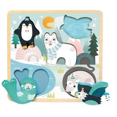 Puzzle d'encastrement animaux du pôle nord avec un côté sensoriel (les poils des animaux)